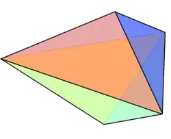 Like other bipyramids, a triangular bipyramid can be constructed by attaching two tetrahedra face-to-face.[2] These tetrahedra cover their triangular base, and the resulting polyhedron has six triangles, five vertices, and nine edges.[3] A triangular bipyramid is said to be right if the tetrahedra are symmetrically regular and both of their apices are on a line passing through the center of the base; otherwise, it is oblique.[4][5]