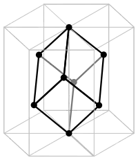 The Bravais lattices in the hexagonal crystal family can also be described by rhombohedral axes.[4] The unit cell is a rhombohedron (which gives the name for the rhombohedral lattice). This is a unit cell with parameters a = b = c; α = β = γ ≠ 90°.[5] In practice, the hexagonal description is more commonly used because it is easier to deal with a coordinate system with two 90° angles. However, the rhombohedral axes are often shown (for the rhombohedral lattice) in textbooks because this cell reveals the 3m symmetry of the crystal lattice.
