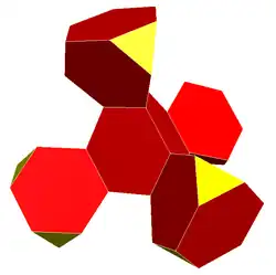 - Between the central tetrahedron and the 4 hexagonal faces of the envelope are 4 irregular truncated tetrahedral volumes, which are the images of the 4 remaining truncated tetrahedral cells.