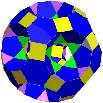 These images show the rhombicosidodecahedron (violet) and the truncated icosidodecahedron (green). If their edge lengths are 1, the distance between corresponding squares is φ. ![]() The toroidal polyhedron remaining after the core and twelve rotundae are cut out |
