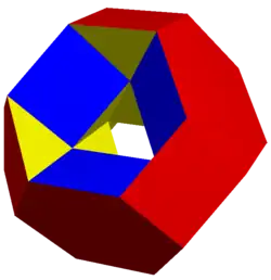 The truncated octahedron can be dissected into a central octahedron, surrounded by 8 triangular cupolae on each face, and 6 square pyramids above the vertices.[18]