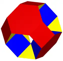 In geometry, the truncated octahedron is the Archimedean solid that arises from a regular octahedron by removing six pyramids, one at each of the octahedron's vertices. The truncated octahedron has 14 faces (8 regular hexagons and 6 squares), 36 edges, and 24 vertices. Since each of its faces has point symmetry the truncated octahedron is a 6-zonohedron. It is also the Goldberg polyhedron GIV(1,1), containing square and hexagonal faces. Like the cube, it can tessellate (or "pack") 3-dimensional space, as a permutohedron.
