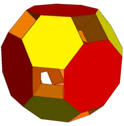 The excavated truncated rhombicuboctahedron is a toroidal polyhedron, constructed from a truncated rhombicuboctahedron with its 12 irregular octagonal faces removed. It comprises a network of 6 square cupolae, 8 triangular cupolae, and 24 triangular prisms. [1] It has 148 faces (8 triangles, 126 squares, 8 hexagons, and 6 octagons), 312 edges, and 144 vertices. With Euler characteristic χ = f + v - e = -20, its genus (g = (2-χ)/2) is 11.