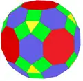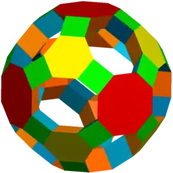 The truncated rhombicuboctahedron is a polyhedron, constructed as a truncation of the rhombicuboctahedron. It has 50 faces consisting of 18 octagons, 8 hexagons, and 24 squares. It can fill space with the truncated cube, truncated tetrahedron and triangular prism as a truncated runcic cubic honeycomb.