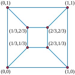 Let G be the graph of a cube, and (selecting one of its quadrilateral faces as the outer face) fix the four vertices of the outer face at the four corners of a unit square, the points whose x and y coordinates are all four combinations of zero and one. Then, if the remaining four vertices are placed at the four points whose x and y coordinates are combinations of 1/3 and 2/3, as in the figure, the result will be a Tutte embedding. For, at each interior vertex v of the embedding, and for each of the two coordinates, the three neighbors of v have coordinate values that are equal to v, smaller by 1/3, and larger by 1/3; the average of these values is the same as the coordinate value of v itself.