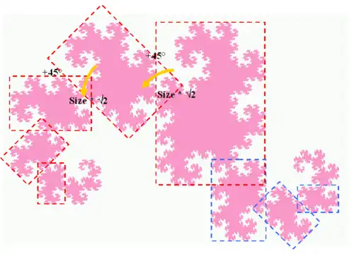The Heighway dragon can be constructed from a base line segment by repeatedly replacing each segment by two segments with a right angle and with a rotation of 45° alternatively to the right and to the left:[2]