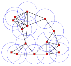 Beginning with the work of Huson & Sen (1995), unit disk graphs have been used in computer science to model the topology of ad hoc wireless communication networks. In this application, nodes are connected through a direct wireless connection without a base station. It is assumed that all nodes are homogeneous and equipped with omnidirectional antennas. Node locations are modelled as Euclidean points, and the area within which a signal from one node can be received by another node is modelled as a circle. If all nodes have transmitters of equal power, these circles are all equal. Random geometric graphs, formed as unit disk graphs with randomly generated disk centres, have also been used as a model of percolation and various other phenomena.[5]