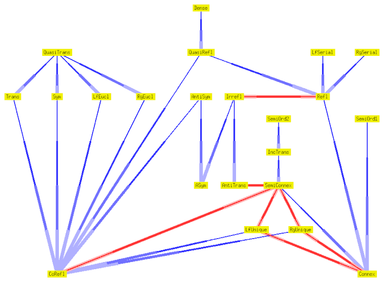 ![]() Implications (blue) and conflicts (red) between properties (yellow) of homogeneous binary relations. For example, every asymmetric relation is irreflexive ("ASym ⇒ Irrefl"), and no relation on a non-empty set can be both irreflexive and reflexive ("Irrefl # Refl"). Omitting the red edges results in a Hasse diagram. |