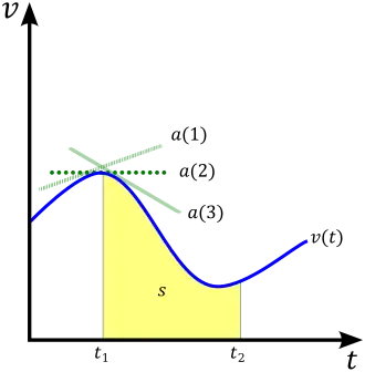 From this derivative equation, in the one-dimensional case it can be seen that the area under a velocity vs. time (v vs. t graph) is the displacement, s. In calculus terms, the integral of the velocity function v(t) is the displacement function s(t). In the figure, this corresponds to the yellow area under the curve.