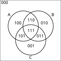 Venn diagrams correspond to truth tables for the propositions , , etc., in the sense that each region of Venn diagram corresponds to one row of the truth table.[23][24] This type is also known as Johnston diagram. Another way of representing sets is with John F. Randolph's R-diagrams.