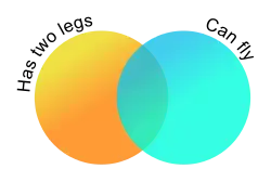 This example involves two sets of creatures, represented as overlapping circles: one circle that represents all types of creatures that have two legs, and another representing creatures that can fly. Each separate type of creature can be imagined as a point somewhere in the diagram. Living creatures that have two legs and can fly—for example, parrots—are then in both sets, so they correspond to points in the region where the two circles overlap. This overlapping region would only contain those elements (in this example, creatures) that are members of both the set of two-legged creatures and set of flying creatures.