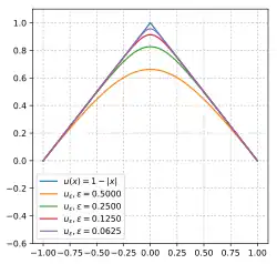 The previous boundary value problem is an eikonal equation in a single spatial dimension with , where the solution is known to be the signed distance function to the boundary of the domain. Note also in the previous example, the importance of the sign of . In particular, the viscosity solution to the PDE with the same boundary conditions is . This can be explained by observing that the solution is the limiting solution of the vanishing viscosity problem as goes to zero, while is the limit solution of the vanishing viscosity problem .[5] One can readily confirm that solves the PDE for each . Further, the family of solutions converges toward the solution as vanishes (see Figure).