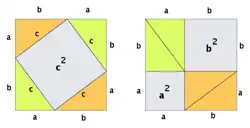 One method of doing so is to visualise a larger square of sides , with four right-angled triangles of sides , and in its corners, such that the space in the middle is a diagonal square with an area of . The four triangles can be rearranged within the larger square to split its unused space into two squares of and .[5]