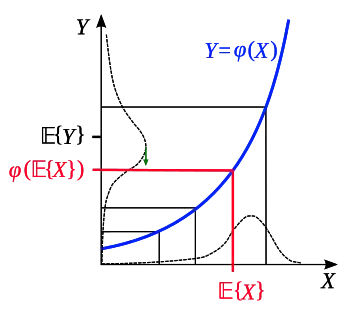 Jensen's inequality can also be proven graphically. A dashed curve along the X axis is the hypothetical distribution of X, while a dashed curve along the Y axis is the corresponding distribution of Y values. The convex mapping Y(X) increasingly "stretches" the distribution for increasing values of X.[6]
