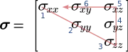 For a symmetric tensor of second rank only six components are distinct, the three on the diagonal and the others being off-diagonal. Thus it can be expressed, in Mandel notation,[3] as the vector