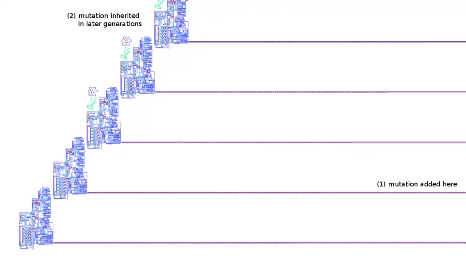 This insight is all the more remarkable because it preceded the discovery of the structure of the DNA molecule by Watson and Crick and how it is separately translated and replicated in the cell—though it followed the Avery–MacLeod–McCarty experiment which identified DNA as the molecular carrier of genetic information in living organisms.[6] The DNA molecule is processed by separate mechanisms that carry out its instructions (translation) and copy (replicate) the DNA for newly constructed cells. The ability to achieve open-ended evolution lies in the fact that, just as in nature, errors (mutations) in the copying of the genetic tape can lead to viable variants of the automaton, which can then evolve via natural selection.[4] As Brenner put it: