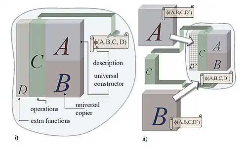 Von Neumann's crucial insight is that the description of the machine, which is copied and passed to offspring separately via the universal copier, has a double use; being both an active component of the construction mechanism in reproduction, and being the target of a passive copying process. This part is played by the description (akin to Turing's tape of instructions) in Von Neumann's combination of universal constructor and universal copier.[4] The combination of a universal constructor and copier, plus a tape of instructions conceptualizes and formalizes i) self-replication, and ii) open-ended evolution, or growth of complexity observed in biological organisms.[3]