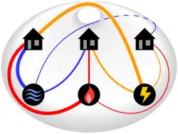 - 1 2 Dudeney, Henry (1917), "Problem 251 – Water, Gas, and Electricity", Amusements in mathematics, vol. 100, Thomas Nelson, p. 73, Bibcode:1917Natur.100..302., doi:10.1038/100302a0, S2CID 10245524. The solution given on pp. 200–201 involves passing a line through one of the other houses.