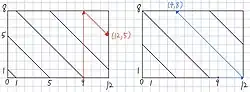 Another variant[6] is when one of the jugs has a known volume of water to begin with; In that case, the achievable volumes are either a multiple of the greatest common divisor between the two containers away from the existing known volume, or from zero. For example, if one jug that holds 8 liters is empty and the other jug that hold 12 liters has 9 liters of water in it to begin with, then with a source (tap) and a drain (sink), these two jugs can measure volumes of 9 liters, 5 liters, 1 liter, as well as 12 liters, 8 liters, 4 liters and 0 liters. The simplest solution for 5 liters is (9,0) → (9,8) → (12,5); The simplest solution for 4 liters is (9,0) → (12,0) → (4,8). These solutions can be visualized by red and blue arrows in a Cartesian grid with diagonal lines (of slope -1 such that on these diagonal lines) spaced 4 liters apart, both horizontally and vertically.