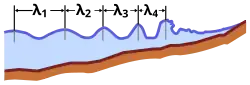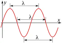 In physics and mathematics, wavelength or spatial period of a wave or periodic function is the distance over which the wave's shape repeats.[1][2] In other words, it is the distance between consecutive corresponding points of the same phase on the wave, such as two adjacent crests, troughs, or zero crossings. Wavelength is a characteristic of both traveling waves and standing waves, as well as other spatial wave patterns.[3][4] The inverse of the wavelength is called the spatial frequency. Wavelength is commonly designated by the Greek letter lambda (λ). For a modulated wave, wavelength may refer to the carrier wavelength of the signal. The term wavelength may also apply to the repeating envelope of modulated waves or waves formed by interference of several sinusoids.[5]