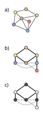 Every graph has a weak 2-coloring. The figure on the right illustrates a simple algorithm for constructing a weak 2-coloring in an arbitrary graph. Part (a) shows the original graph. Part (b) shows a breadth-first search tree of the same graph. Part (c) shows how to color the tree: starting from the root, the layers of the tree are colored alternatingly with colors 1 (dark) and 2 (light).