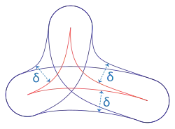 Let be a finitely generated group, and be its Cayley graph with respect to some finite set of generators. The set is endowed with its graph metric (in which edges are of length one and the distance between two vertices is the minimal number of edges in a path connecting them) which turns it into a length space. The group is then said to be hyperbolic if is a hyperbolic space in the sense of Gromov. Shortly, this means that there exists a such that any geodesic triangle in is -thin, as illustrated in the figure on the right (the space is then said to be -hyperbolic).