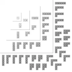 - ↑ For instance the skew diagram consisting of a single square at position (2,4) can be obtained by removing the diagram of μ = (5,3,2,1) from the one of λ = (5,4,2,1), but also in (infinitely) many other ways. In general any skew diagram whose set of non-empty rows (or of non-empty columns) is not contiguous or does not contain the first row (respectively column) will be associated to more than one skew shape.