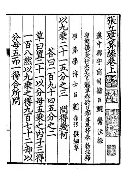 Zhang Qiujian Suanjing (張邱建算經; The Mathematical Classic of Zhang Qiujian) is the only known work of the fifth century Chinese mathematician, Zhang Qiujian. It is one of ten mathematical books known collectively as Suanjing shishu (The Ten Computational Canons). In 656 CE, when mathematics was included in the imperial examinations, these ten outstanding works were selected as textbooks. Jiuzhang suanshu (The Nine Chapters on the Mathematical Art) and Sunzi Suanjing (The Mathematical Classic of Sunzi) are two of these texts that precede Zhang Qiujian suanjing. All three works share a large number of common topics. In Zhang Qiujian suanjing one can find the continuation of the development of mathematics from the earlier two classics.[1] Internal evidences suggest that book was compiled sometime between 466 and 485 CE.