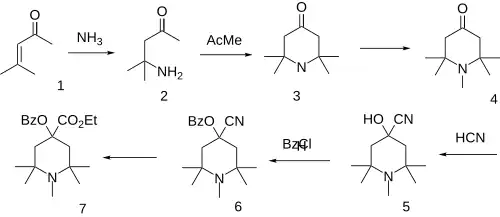 The Aldol condensation between two equivalents of acetone gives Mesityl oxide [141-79-7] (1) (isophorone is a side-product of this reaction). Ammonolysis of mesityl oxide formed diacetonamine [625-04-7] (2). The reaction of this product with acetone then gives 2,2,6,6-tetramethyl-4-piperidone [826-36-8] (3). N-methylation of the secondary amine gives 1,2,2,6,6-pentamethylpiperidin-4-one [5554-54-1] (4). Cyanohydrin formation gives CID:434556 (5). Esterification of the tertiary alcohol with benzoyl chloride gives (6). Pinner reaction of the nitrile with EtOH/H+ affords alpha-eucaine (7).