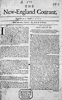 The outbreak was the first time in American medicine where the press was used to inform (or alarm) the general public about a health crisis.[1] The New England Courant, under the leadership of its new editor 16 year-old Benjamin Franklin, continued to publish satirical articles about the Mather and inoculation in the months following the epidemic.[7] Boylston wrote an account of his experiences with inoculation in An Historical Account of the Small Pox Inoculated in New England. Most of Boston's clergy seemed to have supported inoculation, and some wrote an op-ed opposing Williams and Douglass's criticism: "tho [Dr. Boylston] has not had... an Academic Education, and congruently not the Letters of some Physicians in town, yet he ought by no means be called Illiterate, Ignorant, etc. Would the town bear that Dr. Cutter or Dr. Davis be so treated?" Minister Benjamin Coleman, believing in inoculation, collected inoculation stories from slaves similar to Onesimus's account and published "Some observations on the new method of receiving the small pox by ingrafting or inoculation" in opposition to Douglass.[5]