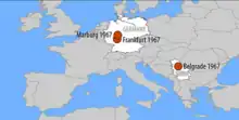The 1967 Marburg virus disease outbreak was the first recorded outbreak of Marburg virus disease.[1] It started in early August 1967 when 30 people became ill in the West German towns of Marburg and Frankfurt and later two in Belgrade, Yugoslavia (now Serbia).[2] The infections were traced back to three laboratories in the separate locations which received a shared shipment of infected African green monkeys.[3] The outbreak involved 25 primary Marburg virus infections and seven deaths, and six non-lethal secondary cases.[2]