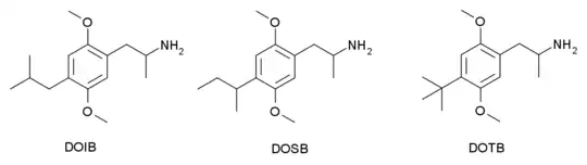 Alternative isomers of DOBU can also be produced, where the 4-(n-butyl) group of DOBU is replaced with any of the three other butyl isomers, the iso-butyl, sec-butyl and tert-butyl compounds being called DOIB, DOSB, and DOTB, respectively.[3][4][5] All are significantly less potent than DOBU, with DOIB being active at around 10–15 mg, and DOSB at 25–30 mg.[3] The most highly branched isomer DOTB was completely inactive in both animal and human trials.[3] However, it was also reported that DOTB and DOAM partially generalized to DOM in animal drug discrimination tests.[6]