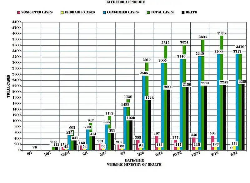 As indicated below and per numbers offered by the United Nations the final death toll was 2,280 with a total of 3,470 cases in DRC in almost a two-year period. This was made very difficult due to the ongoing military attacks in the region which created a perfect storm for the virus, despite there being a vaccine.[37] rVSV-ZEBOV or Ebola Zaire vaccine live, is a vaccine that prevents Ebola caused by the Zaire ebolavirus.[38] The graph of reported cases reflects cases that were not able to have a laboratory test sample before burial as probable cases.[39]