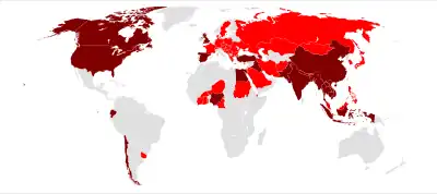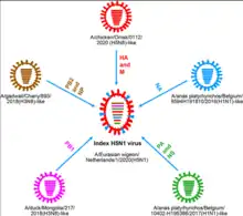 H5N6 and H5N8 viruses with the H5-2.3.4.4b hemagglutinin (HA) gene became prominent globally in 2018–2020.[8][10] In 2020, reassortment (genetic "swapping") between these H5-2.3.4.4b viruses and other strains of avian influenza led to the emergence of a H5N1 strain with a H5-2.3.4.4b gene.[8] The virus then spread across Europe, first detected there in the autumn of 2020, before spreading to Africa and Asia.[1] It continues to swap genes with local flu viruses as it crosses the globe.[11]: (fig.1)