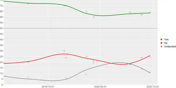 Support for assisted dying between 2000 and 2019 averaged at around 68%,[5] and prior to the act passing into law in 2019, support for some kind of medically assisted euthanasia for the terminally ill was polled at 74% in April,[13] and 72% in July of 2019.[5]