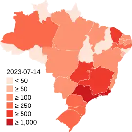 The 2022–2023 mpox outbreak in Brazil is a part of the ongoing outbreak of human mpox caused by the West African clade of the monkeypox virus. The outbreak was first reported in Brazil on 9 June 2022 when a man in São Paulo was registered as the country's index case.[1]