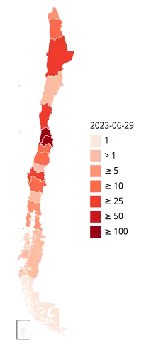 The 2022–2023 mpox outbreak in Chile is a part of the outbreak of human mpox caused by the West African clade of the monkeypox virus. The outbreak reached Chile on 17 June 2022.[2]