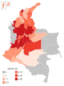 On July 8, the National Institute of Health confirmed a new case of the disease in Bogota from a person who had been in contact with an infected person from Italy when they had traveled to Europe.[24] On July 23, following the follow-up of several cases, health authorities began an extensive surveillance phase.[25] On the same day, the National Institute of Health confirmed that the number of cases in the country reached 10.[26] On July 25, the first case of a person who had been in Argentina was reported in the department of Cundinamarca, specifically in the municipality of Cajicá.[27] On July 29, the first case was detected in Pereira, capital of the department of Risaralda.[28] On July 30, the National Institute of Health confirmed the first case in the department of Valle del Cauca, specifically in the city of Cartago located in the north of the department.[29]