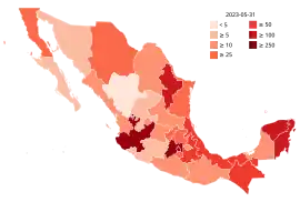The 2022–2023 mpox outbreak in Mexico is part of the larger outbreak of human mpox caused by the West African clade of the monkeypox virus. Mexico is the twenty-fourth country outside of Africa to experience an endemic mpox outbreak. The first case was reported in Mexico City, Mexico, on May 28, 2022.[1] As of December 8th 2022, Mexico had confirmed a total of 3455 cases in all 32 states and 4 deaths.