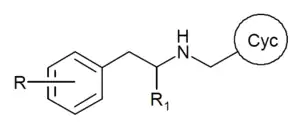 The 25-NB compounds are mostly N-benzylphenethylamines,[2][1] though in some cases the phenyl ring of the N-benzyl group is replaced by other heterocycles such as thiophene, pyridine, furan, tetrahydrofuran, benzodioxole or naphthalene, among others.[40][41]