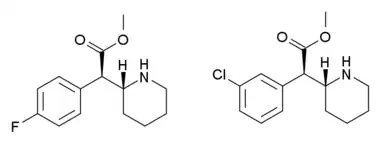 - ↑ Schweri MM, Deutsch HM, Massey AT, Holtzman SG (May 2002). "Biochemical and behavioral characterization of novel methylphenidate analogs". The Journal of Pharmacology and Experimental Therapeutics. 301 (2): 527–35. doi:10.1124/jpet.301.2.527. PMID 11961053.