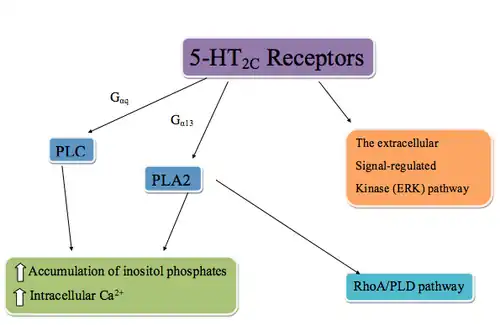 The 5-HT2C receptors are G protein–coupled receptors that are coupled to phospholipase C (PLC) via Gαq, phospholipase A2 (PLA2), and possibly Gα13. PLC metabolizes phosphatidylinositol 4,5-bisphosphate into inositol 1,4,5-triphosphate (IP3). IP3 regulates cellular Ca2+ flux by binding to IP3 receptors, inducing Ca2+ release. In addition, the activation of PLA2 also results in recruitment of a RhoA/PLD pathway through RhoA, an enzyme that regulates a wide spectrum of cellular functions through PLD (phospholipase D) target protein. The 5-HT2C receptors can also stimulate the extracellular signal-regulated kinase (ERK) pathway which is activated by neurotrophins and other neuroactive chemicals. Production of these chemicals effects neuronal differentiation, survival, regeneration, and structural and functional plasticity. Early studies of the ERK pathway showed that mood stabilizers for the treatment of manic-depressive illness stimulated the pathway. This led to the understanding that stimulation of the 5-HT2C receptors could regulate manic-depressive conditions in a manner similar to mood stabilizers.[23][24][25][3]