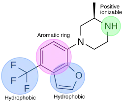 In the drug discovery process of a 5-HT2C agonist, a pharmacophore module has been used to discover novel 5-HT2C receptor ligands. The pharmacophore has four features; one aromatic ring, two hydrophobic features and one positive ionizable feature. Figure 4 shows an example of a compound that fits the agonist pharmacophore perfectly. The nitrogen atom of piperazine fits the positive ionizable feature, the benzofuran part fits the aromatic ring and one hydrophobic, and the trifluoromethane part fits another hydrophobic feature of the pharmacophore.[32]