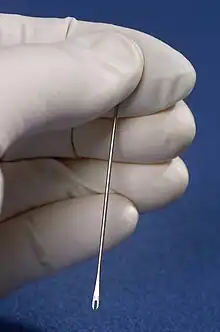 The vaccine is administered using a bifurcated stainless steel needle. The needle is dipped into the vaccine solution and used to prick the skin several times in the upper arm. The vaccinia virus will begin to grow at the injection site. It will cause a localized infection, with a red itchy sore produced at the vaccination site within three to four days. If the infection occurs, that is an indication that the vaccine was successful. Ultimately, the sore turns into a blister and then dries up. A scab forms and then falls off in the third week, leaving a small scar behind.[11]