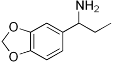 ALPHA (alpha-ethyl-3,4-methylenedioxybenzylamine) is a lesser-known psychedelic drug and a substituted benzylamine. It is also the benzylamine analog of 3,4-methylenedioxyamphetamine (MDA). ALPHA was first synthesized by Alexander Shulgin. In his book PIHKAL on the MDA page, the threshold dosage is listed as 10 mg.[1] At mild threshold dosages (around 10 mg) there are eyes-closed "dreams" with some body tingling, at higher doses (up to 140 mg) was reported to produce a pleasant, positive feeling. This compound is not anoretic at any dose. It lasts about 3 hours. Very little data exists about the pharmacological properties, metabolism, and toxicity of ALPHA.