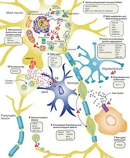 This figure shows ten proposed disease mechanisms for ALS and the genes associated with them.[82]