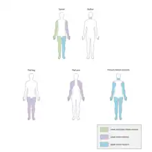 Although the initial site of symptoms and subsequent rate of disability progression vary from person to person, the initially affected body region is usually the most affected over time, and symptoms usually spread to a neighbouring body region. For example, symptoms starting in one arm usually spread next to either the opposite arm or to the leg on the same side.[23] Bulbar-onset patients most typically get their next symptoms in their arms rather than legs, arm-onset patients typically spread to the legs before the bulbar region, and leg-onset patients typically spread to the arms rather than the bulbar region.[37] Over time, regardless of where symptoms began, most people eventually lose the ability to walk or use their hands and arms independently. Less consistently, they may lose the ability to speak and to swallow food. It is the eventual development of weakness of the respiratory muscles, with the loss of ability to cough and to breathe without support, that is ultimately life-shortening in ALS.[5]