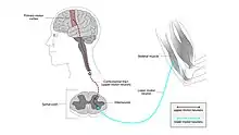Classic ALS involves neurons in the brain and spinal cord (upper motor neurons, highlighted red), as well as the lower motor neurons, which go from the spinal cord to the muscles, highlighted teal.[23]