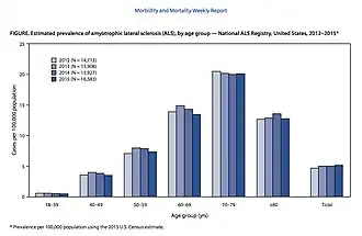 126. 1 2 3 4 5 Mehta P, Kaye W, Raymond J, Punjani R, Larson T, Cohen J, et al. (November 2018). "Prevalence of Amyotrophic Lateral Sclerosis – United States, 2015". MMWR. Morbidity and Mortality Weekly Report. 67 (46): 1285–1289. doi:10.15585/mmwr.mm6746a1. PMC 5858037. PMID 30462626.
