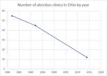 In the period between 1972 and 1974, the state had an illegal abortion mortality rate per million women aged 15–44 of between 0.1 and 0.9.[83] In 1990, 1,314,000 women in the state faced the risk of an unintended pregnancy.[79] In 2010, the state had nine publicly funded abortions, of which nine were federally funded and none were state funded.[84] In 2014, 48% of adults said in a poll by the Pew Research Center that abortion should be legal in all or most cases.[85] The 2023 American Values Atlas reported that, in their most recent survey, 64% of Ohioans said that abortion should be legal in all or most cases.[86]